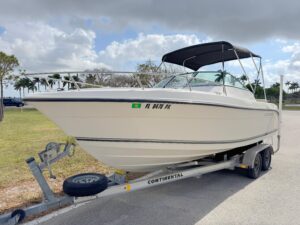 Boston Whaler 28 Conquest Specifications - Standard Equipment Deck - Cockpit - Self-bailing cockpit - Molded-in nonskid pattern - 28-inch interior freeboard - Bow and stern U-bolts - Welded 316 stainless steel bow rail - 8-inch cleats (2 bow, 2 spring line, 2 stern with hawse pipes, 1 anchor locker) - Heavy-duty rub-rail - Covered telescoping swim ladder with stainless steel grab-rail - Motorwell drains - Anodized aluminum-framed windshield with vents - Rod holders (4 gunnel-mount, 3 transom-mount) - Stainless steel cockpit toerails - Stainless steel grab-rails (2) integral bow pulpit with roller - Cockpit coaming bolsters - Cockpit shower - Red striping and graphics Mechanical - Automatic battery switch - isolator - Battery box (3) with switches - Hydraulic trim tabs - 148-gallon fuel tanks (2) - Bilge pump aft and forward - Shore power with battery charger - Hot and cold pressurized water system - Teleflex hydraulic tilt steering system - Stainless steel steering wheel - Electrical switch panel with circuit protection - Windshield wipers port and starboard - Transducer mount areas - Navigation lights - Cockpit lighting - Livewell with light and raw water wash-down - Compass - Mercury dual pre-rig Cabin Interior - Teak and holly cabin sole - Opening hatch with screen - Opening ports with screens (4) - Sliding window in mid-cabin berth - Cabin lights - Sliding cabin door - Easy-clean interior materials - Forward dinette - berth - Mid-cabin double berth - Refrigerator 12V - 110V - Enclosed head with VacuFlush head, holding tank, dockside pump-out and overboard discharge - Head and galley sinks with hot and cold water faucets - Dinette table - forward berth filler - Carbon monoxide detector - Butane single-burner stove - Microwave - Clarion stereo with CD player, four speakers and remote control at the helm Storage - Cedar-lined hanging locker - Bow anchor locker with drain - Bow storage lockers under dinette - berth - Under-gunnel rod racks - Cabin interior rod racks - In-deck fishboxes (2) with pump-out - Storage drawer under helm seat - Tackle drawers - Electronics panel at helm - Drink holders - Fire extinguisher pocket - Battery and oil storage Seating - Sliding helm seat with cushions - Hideaway stern bench seat - Helm and passenger molded-in footrests - Companion bench seat - Aft-facing seat, starboard Boston Whaler 28 Conquest Optional Equipment - Radar arch with cockpit flood lights, dome light and rod holders (4) - Radar arch with topgun outriggers, cockpit flood lights, dome light and rod holders (4) - Striping and graphics (blue or green) - Hardtop with topgun outriggers, electronics box, cockpit flood light, dome lights and rod holders (4) - Hardtop with electronics box, cockpit flood light, dome light and 4 rod holders - Electric single-burner stove - Windlass with rode - Reverse-cycle air conditioning - Generator - Prep station behind helm seat (in lieu of aft-facing seat) - Enclosed head with VacuFlush toilet, holding tank and dockside pump-out - Mercury pre-rig (OptiMax) Canvas - Sun-top with boot (red, blue or green) - Weather curtain (red, blue or green), sun-top or hardtop - Aft drop curtain (red, blue or green), sun-top or hardtop